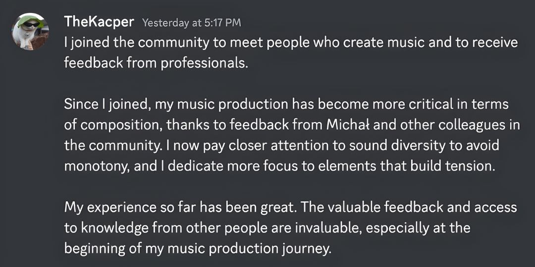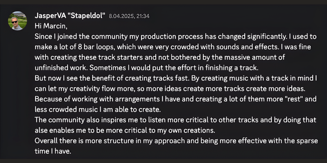 Our community members have experienced significant transformations in their music production journeys. They've shared their motivations for joining, the changes they've undergone, and their experiences within the community.